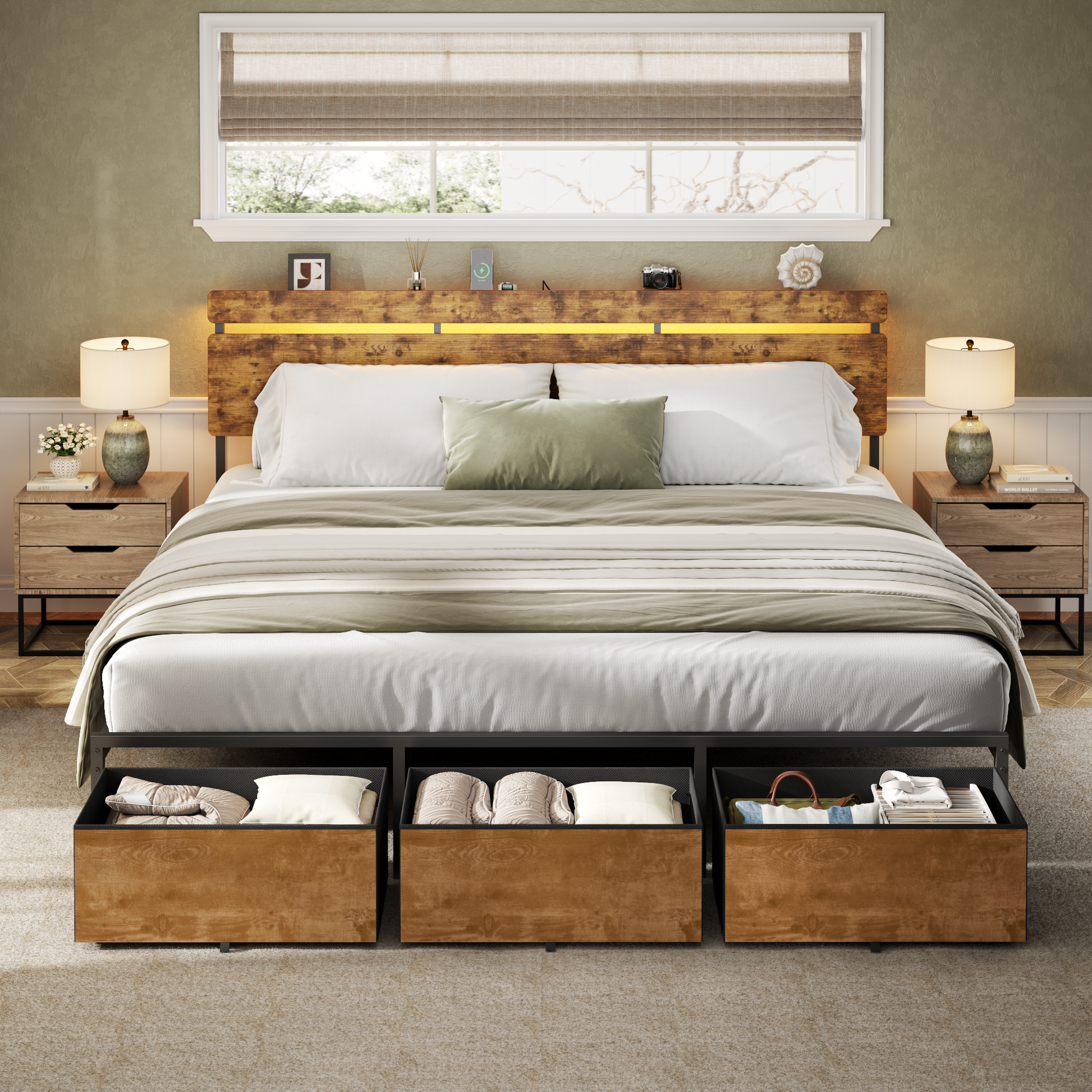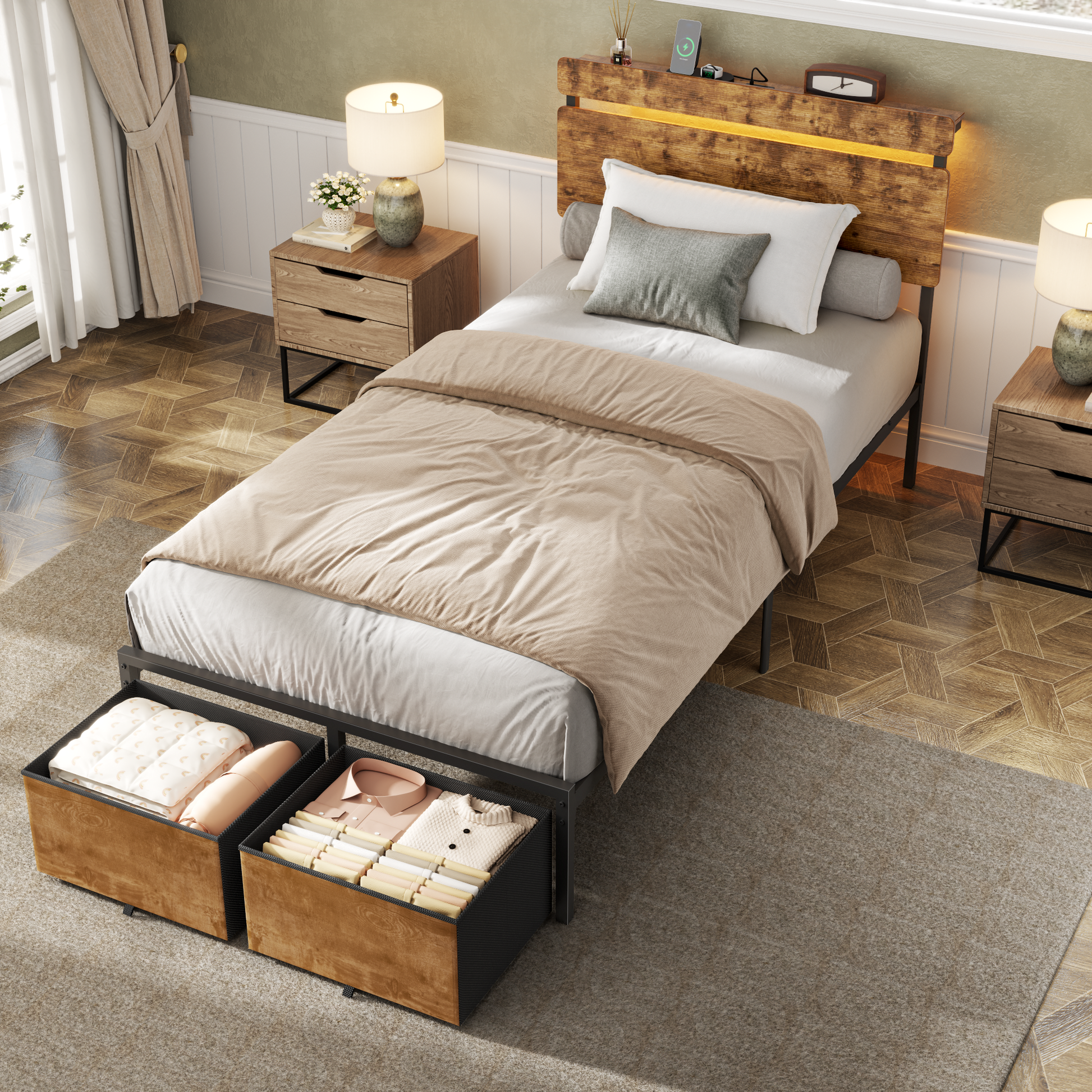 Bed Frames with 2 Fabric Storage Drawers, Wood Storage Headboard with Charging Station & LED Light, All-Metal Support System, No Noise, No Box Spring Needed, Easy Assembly, Retro Brown