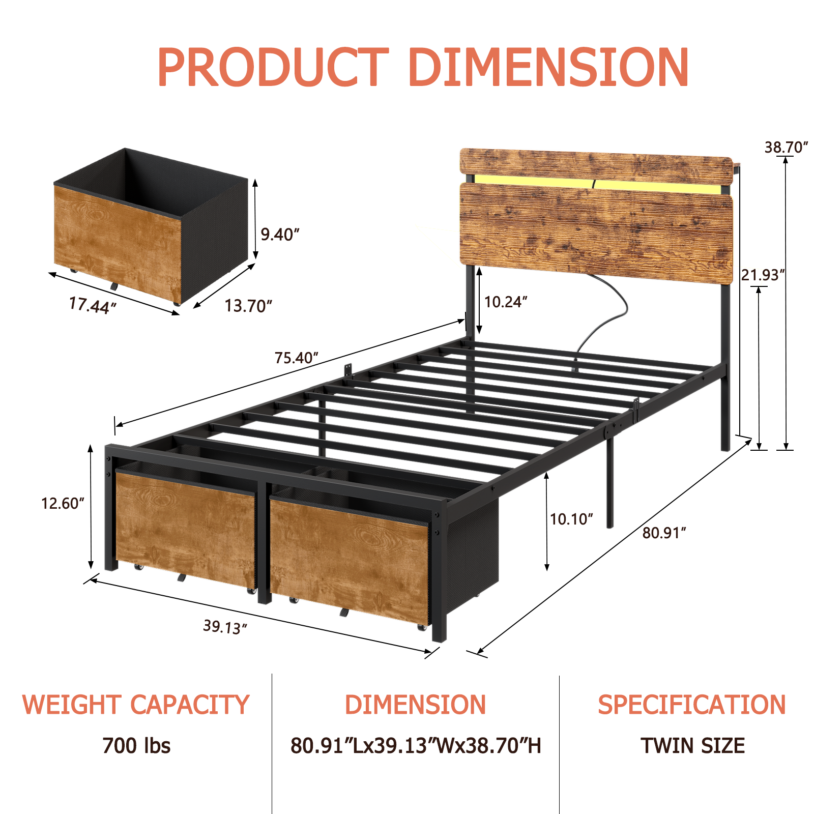 Smart RGB LED Lights: This bed frame twin comes with an RGB light strip, controllable via remote or mobile app. It offers over 60,000 color options, plus multiple modes to explore—including style, music, and microphone modes, as well as a timer function. You can freely adjust brightness, color, and mode to match your mood and environment, making it a great addition to your bedroom.